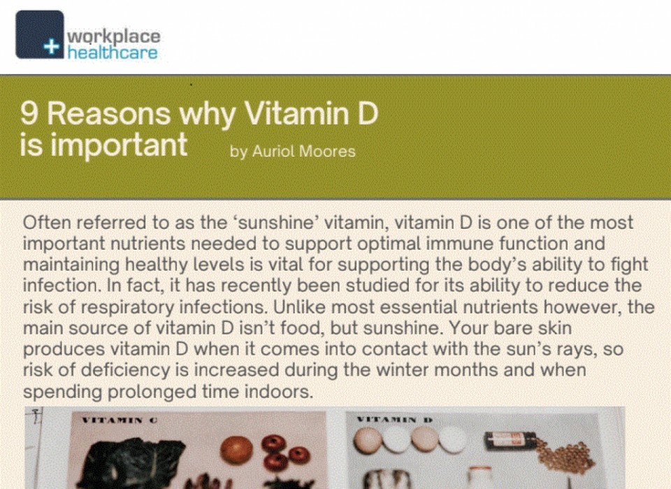 For a copy of our Vitamin D fact sheet written by our nutriton team expert Auriol Moores or to book your visit, call - 0845 2263391/07957 331172 or email victoria@workplacehealthcare.co.uk